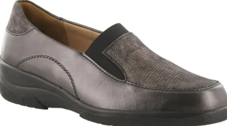 Instap schoen van Solidus in grijs leer met aan de bovenzijde elastiek, waardoor een schoen altijd beter past. Geschikt voor een steunzool gemaakt op een J wijdte, op de leest Hedda, dit is een gebroken wijdte breed van voor en smaller in de hielpartij. ||Solidus is een Duits fabricaat, met diverse leesten en wijdtematen, van smal tot super breed. Ze gebruiken zachte leersoorten, waardoor ze vaak zeer comfortabel en geschikt voor gevoelige voeten zijn. Vor de zeer gevoelige en of diabete voet, maken ze ook nog een speciale collectie “Solicare” Veel leesten en artikelen komen vaak weer terug, veelal in een andere uitvoering.