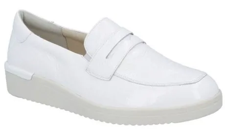 Pennyloafer van Solidus op een brede K wijdte op de leest Kathy in wit kreuklak. met een perforatie. Aan de zijkanten zit elastiek waardoor je atid een betere pasvorm hebt. De instapper heeft een bijna platte hak en een soepele buigzame zool. De voetbedden zijn uitneembaar en de schoen is dus geschikt voor uw eigen steunzool. ||Solidus is een Duits fabricaat, met diverse leesten en wijdtematen, van smal tot super breed. Ze gebruiken zachte leersoorten, waardoor ze vaak zeer comfortabel en geschikt voor gevoelige voeten zijn. Voor de zeer gevoelige en of diabete voet, maken ze ook nog een speciale collectie “Solicare” Veel leesten en artikelen komen vaak weer terug, veelal in een andere uitvoering. Solidus koopt u online bij Ruttenschoenen.nl