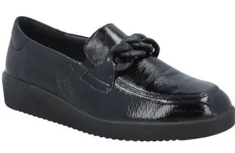 Loafer van Solidus op een brede K wijdte op de leest Kathy in zwart kreuklak. Aan de zijkanten zit elastiek waardoor je altijd een betere pasvorm hebt. De instapper heeft een bijna platte hak en een soepele buigzame zool. De voetbedden zijn uitneembaar en de schoen is dus geschikt voor uw eigen steunzool. ||Solidus is een Duits fabricaat, met diverse leesten en wijdtematen, van smal tot super breed. Ze gebruiken zachte leersoorten, waardoor ze vaak zeer comfortabel en geschikt voor gevoelige voeten zijn. Voor de zeer gevoelige en of diabete voet, maken ze ook nog een speciale collectie “Solicare” Veel leesten en artikelen komen vaak weer terug, veelal in een andere uitvoering. Solidus koopt u online bij Ruttenschoenen.nl