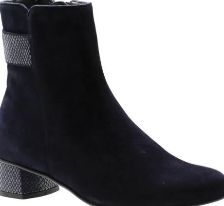 Korte laars van Hassia in blauw glad kalfssuede met een sierband bij de enkel. De sierband heeft dezelfde print als de hak. Gemaakt op een brede H wijdte op de leest Siena met een blokhak. Met een uitneembaar voetbed waardoor geschikt voor uw eigen steunzool. ||Hassia is een Duits fabrikaat, met diverse leesten en wijdtematen. Het zijn vaak wat luxere schoenen, vervaardigd uit mooie kalfsleersoorten. Het zijn vaak wat luxere schoenen, vervaardigd uit mooie kalfsleersoorten.