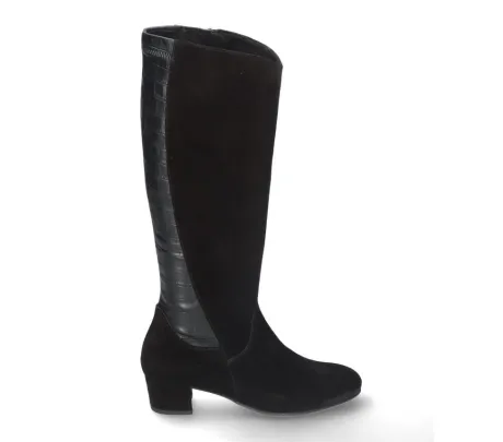 Lange laarzen zijn lastig op de webshop te bestellen omdat ze op verschillende plaatsen goed moeten zitten. En wij vaak dan weten wat u het beste kan passen. We adviseren dan ook om ze in de winkel te komen passen. ||Lange laars van Durea in zwart suede op een brede H wijdte op de leet 915 met een M schacht (ca 36 cm). Bij de kuiten zit stretch materiaal, waardoor er nog iets extra ruimte is. De voetbedden zijn uitneembaar en daardoor is die geschikt voor uw eigen steunzool. Uiteraard heeft de laars een stevig contrefort. ||||Durea is een Nederlands fabricaat, met diverse leesten en wijdtematen. Het ontwerp en de afwerking geschiedt in Drunen. De productie vindt in het buitenland plaats, waar Durea fabrieken bezit, onder toezicht van eigen mensen. Iedere schoen ondergaat ca 200 handelingen, Daar Durea alles in eigen beheer heeft kunnen zij hun hoge kwaliteit waarborgen. Durea koopt u online bij Ruttenschoenen.nl of Dureaonline.nl