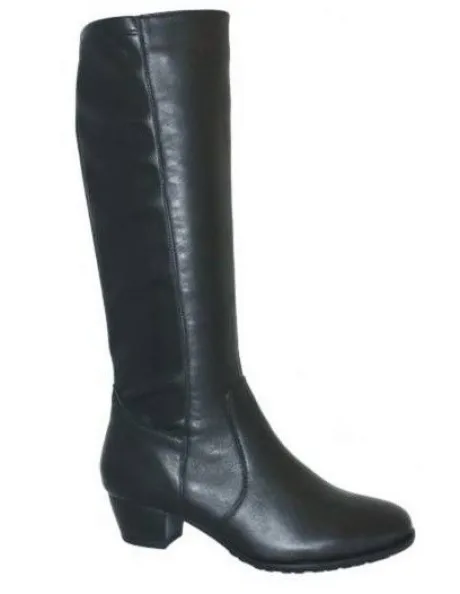 Lange laarzen zijn lastig op de webshop te bestellen omdat ze op verschillende plaatsen goed moeten zitten. En wij vaak dan weten wat u het beste kan passen. We adviseren dan ook om ze in de winkel te komen passen. ||Lange laars van Helioform in zwart leer met een stretch achterkant waardoor rek mogelijkheid. De laars is geschikt voor een smalle kuit ca 33 cm en een voetwijdte H. De hak is laag ca 35 mm. De voetbedden zijn uitneembaar en de laars is dus geschikt voor uw eigen steunzool. ||Helioform is een Nederlands fabrikaat in een populaire prijsklasse, de schoenen worden in Nederland ontworpen en tegenwoordig onder streng toezicht van eigen mensen onder goede arbeidsomstandigheden in India gemaakt. Ze maken verschillende wijdtematen en meestal zijn ze geschikt voor eigen steunzool. Helioform koop je online bij Ruttenschoenen.nl