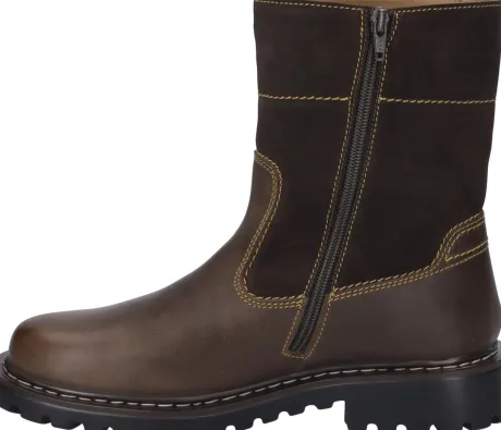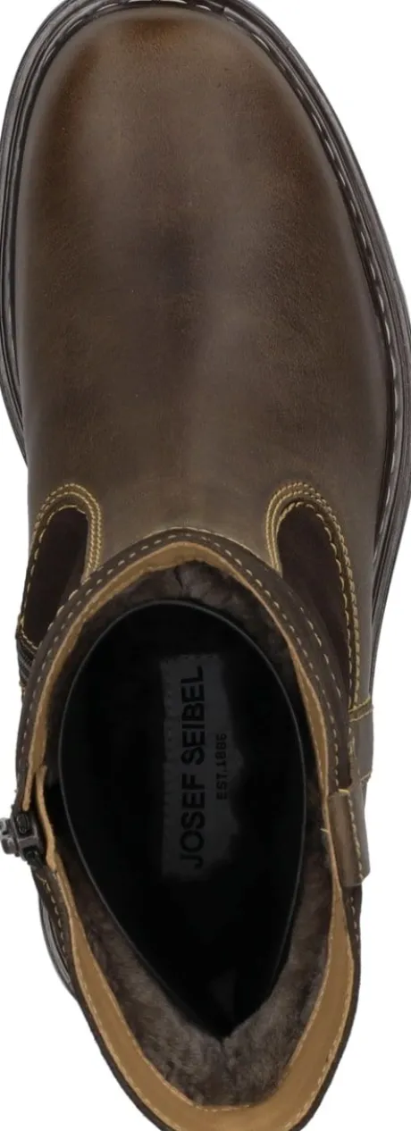 Korte herenlaars van Josef Seibel in bruin leer met suede met lamsvacht voering. De laars heeft aan de binnen zijde een rits waardoor die makkelijk is aan en uit te trekken. Het voorblad is glad en de zool heeft een profiel. De voetbedden zijn uitneembaar. ||Josef Seibel maakt schoenen sinds 1886. Het is een familiebedrijf en de fabriek staat in het Duitse Hauenstein. Ze maken leren schoenen met een goede pasvorm en een prima prijs/kwaliteit verhouding. Vaak zijn de voetbedden uitneembaar.