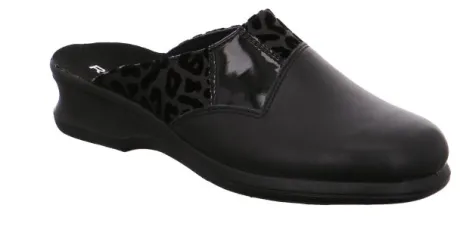 Dames pantoffelslipper van Rohde in zwart leer met een lakstukje en een leopard print. De slipper heeft een ingebouwd voetbed. De hak is laag ca 3 cm. ||Rohde is van oorsprong een Duitse firma en inmiddels overgenomen door een Italiaan. Rohde wordt hoofdzakelijk in de aziatische landen gefabriceerd.