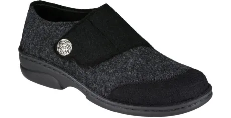 Berkeman dames pantoffel met uitneembaar voetbed, dus geschikt voor uw eigen steunzool. De pantoffel is verstelbaar met een klittenband. Er zit een lage hak van ca 25 mm onder. De pantoffel heeft een bovenkant van 70 % wollen vilt versterkt met 30 % nylon in een grijs combinatie. ||Berkeman pantoffels koopt u online bij Ruttenschoenen.nl