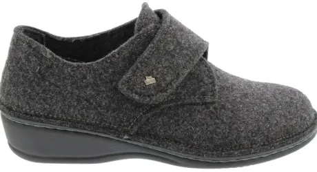 Klittenband pantoffel van FinnComfort in grijs wollen vilt. Op een brede leest, waarbij de voetbedden uitneembaar zijn. De pantoffel biedt bij de tenen extra veel ruimte. Met een lage stabiele hak van 25 mm. De zool is met een handgenaaide steek verbonden. ||FinnComfort is een Duits merk , wat nog steeds in Duitsland wordt gemaakt en vaak ook deels nog handwerk is, dat merk je en dat voel je. De optimale pasvorm verzekert een schokabsorberende en natuurlijke afwikkeling van de voet. De schoen biedt veel ruimte bij de tenen, zoals het eigenlijk hoort. Er zijn verschillende types en leesten, waar FinnComfort geen wijdte aan verbindt, welke wij proberen aan te geven met welke wijdte dit overeenkomt. Finn Comfort koopt u online bij Ruttenschoenen.nl