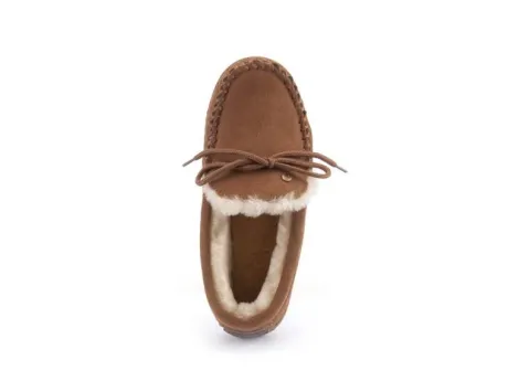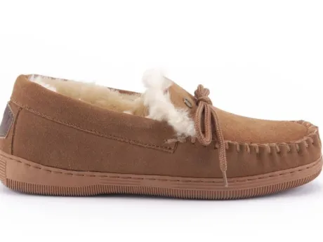 Pantoffel van Warmbat gevoerd met lamsvacht in cognac suede. Gemaakt op een mocassin maakwijze. De pantoffel is lekker zacht op de huid en heeft een comfortabele antislip, slijtvaste en schokdempende zool. ||||Warmbat komt uit Australie waar zij al meer dan 100 jaar wol van de merino schaap gebruiken. Er wordt 100% merino wol gebruikt wat het voordeel geeft van een goede kwaliteit en een goed ademend vermogen. De vezels kunnen tot 30% van het eigen gewicht aan vocht absorberen. ook is deze natuurlijke vacht temperatuur regulerend waardoor ze het hele jaar door zijn te dragen. Daarbij is het van natuur ook antibacterieel