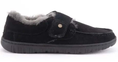 Pantoffel van Warmbat gevoerd met lamsvacht in zwart suede. De pantoffel is met klittenband te verstellen. Gemaakt op een mocassin maakwijze. De pantoffel is lekker zacht op de huid en heeft een comfortabele antislip, slijtvaste en schokdempende zool. De voetbedden zijn uitneembaar. ||||Warmbat komt uit Australie waar zij al meer dan 100 jaar wol van de merino schaap gebruiken. Er wordt 100% merino wol gebruikt wat het voordeel geeft van een goede kwaliteit en een goed ademend vermogen. De vezels kunnen tot 30% van het eigen gewicht aan vocht absorberen. ook is deze natuurlijke vacht temperatuur regulerend waardoor ze het hele jaar door zijn te dragen. Daarbij is het van natuur ook antibacterieel