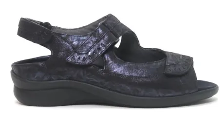 Sandaal van Durea in blauw metallic leer met print op nubuck basis. De sandaal is verstelbaar met 2 klittenbanden op de voet en 1 aan de hielpartij. De sandaal is speciaal gemaakt voor superbrede en gevoelige voeten op een M wijdte op de leest 220. Het voetbed is uitneembaar dus geschikt voor uw eigen steunzool. De hak is stabiel en maar 2 cm hoog. De PU zool is schokabsorberend en geeft veel demping. De sandaal is gevoerd met Fashmoo en daardoor extra zacht aan de voeten. |||Durea is een Nederlands fabricaat, met diverse leesten en wijdtematen. Het ontwerp en de afwerking geschiedt in Drunen. De productie vindt in het buitenland plaats, waar Durea eigen fabrieken bezit, onder toezicht van eigen mensen. Iedere schoen ondergaat ca 200 handelingen, Daar Durea alles in eigen beheer heeft kunnen zij hun hoge kwaliteit waarborgen. Durea koopt u online en offline bij Ruttenschoenen.nl