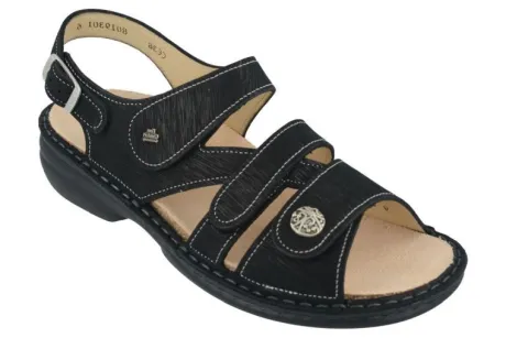 Dames sandaal van FinnComfort in zwart suede op een brede leest ca een K wijdte. De sandaal is gevoerd met kalfsleer en wordt deels met de hand gemaakt. De kurken voetbedden zijn uitneembaar en de sandaal is op 3 plaatsen met klittenband te verstellen, bij de hiel zit een te verstellen gesp. De hakhoogte is 25mm. De kurken voetbedden zijn dik, waardoor een dunne steunzool over het algemeen minder geschikt is. ||FinnComfort is een Duits merk , wat nog steeds in Duitsland wordt gemaakt en vaak ook deels nog handwerk is, dat merk je en dat voel je. De optimale pasvorm verzekert een schokabsorberende en natuurlijke afwikkeling van de voet. De schoen biedt veel ruimte bij de tenen, zoals het eigenlijk hoort. Er zijn verschillende types en leesten, waar FinnComfort geen wijdte aan verbindt, welke wij proberen aan te geven met welke wijdte dit overeenkomt. FinnComfort koopt u off en online bij Ruttenschoenen.nl