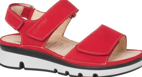 Sandaal van Ganter in rood nubuck op een G wijdte op de leest Gianna. Geschikt voor een gemiddelde tot brede voet. De sandaal is verstelbaar met 3 klittenbanden. De sandaal heeft een stabiele zool en een sleehak met iets verhoogde hak. Het kurken voetbed is uitneembaar en is dus ook geschikt voor uw eigen steunzool. ||Ganter is een Duits fabricaat, met diverse leesten en wijdtematen. Zij hebben pasvorm, natuur en milieu hoog in het vaandel. Ze maken tijdloze schoenen en gebruiken daarbij materialen die zo min mogelijk het milieu belasten. Zoals plantaardig gelooid leer, kurken voetbedden tot aan papier uit duurzame bosbouw. Ganter koopt u online bij ruttenschoenen.nl