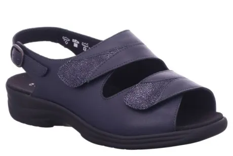 Sandaal van Solidus met 2 klittenbanden en van achter een drukknop die te verstellen is in blauw leer met een glinster print inzet op de banden. Gemaakt op een super brede M wijdte op de leest Moni met een bijna platte hak van ca 15 mm hoog. De voetbedden zijn uitneembaar en ze zijn dus geschikt voor uw eigen steunzool. ||||Solidus is een Duits fabricaat, met diverse leesten en wijdtematen, van smal tot super breed. Ze gebruiken zachte leersoorten, waardoor ze vaak zeer comfortabel en geschikt voor gevoelige voeten zijn. Voor de zeer gevoelige en of diabete voet, maken ze ook nog een speciale collectie “Solicare” Veel leesten en artikelen komen vaak weer terug, veelal in een andere uitvoering. Solidus koopt u online bij Ruttenschoenen.nl
