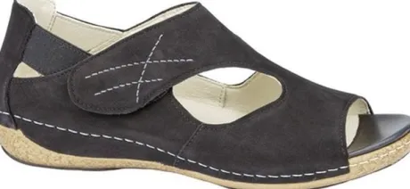 Sandaal van Waldlaufer, geschikt voor een brede voet op een brede H wijdte in zwart nubuck op de leest Heliet. De sandaal heeft een dichte hiel, waarbij aan de zijkanten elastiek zit. Op de wreef is de sandaal te verstellen met een klittenband. De hak is bijna plat en de sandaal is licht van gewicht. De voetbedden zijn uitneembaar en daardoor is de sandaal geschikt voor uw eigen steunzool. ||Waldlaufer is een Duits merk. Kenmerkend is dat ze licht zijn van gewicht en zacht van leer. Er zijn verschillende wijdtematen en meestal zijn de voetbedden uitneembaar.