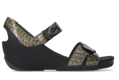 Sandaal van bronskleurig lak met een grove croco print gemaakt op de leest Evolution. De sandaal is verstelbaar met een klittenband over de voorvoet en de wreef. De sandaal heeft een sleehak met een plateauzool waardoor die hoger lijkt dan die is. Het voetbed loopt heerlijk zacht en is uitneembaar waardoor de sandaal ook geschikt is voor een eigen zool. De hak is ca 4 cm. ||Wolky is een nederlands merk, wat grotendeels in Portugal geproduceerd wordt. Kenmerkend zijn de zachte zolen waarop u verend loopt. Het lopen op wolken effect. Wolky koopt u online bij Ruttenschoenen.nl