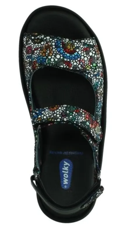 Sandaal van Wolky in een veel kleurige combinatie met een fantasieprint op suède basis, verstelbaar met 2 klittenbanden en een klittenband bij de hiel. Gemaakt op de leest Swing. De sandaal heeft een zeer comfortabele zool met een extra afwikkeling wat het lopen vergemakkelijkt. De voetbedden zijn uitneembaar en daardoor geschikt voor een steunzool. Wolky is een Nederlands merk, wat grotendeels in Portugal geproduceerd wordt. Kenmerkend zijn de zachte zolen waarop u verend loopt. Het lopen op wolken effect. Wolky koopt u online bij Ruttenschoenen.nl