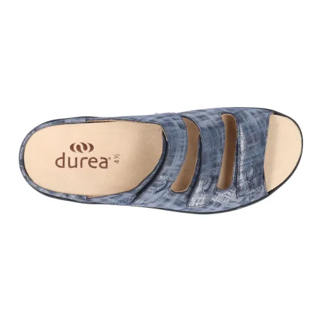 Slippers van Durea in een blauwe combinatie leer met een fantasieprint. De slipper is verstelbaar met 3 klittenbanden op de voet. Gemaakt op een G wijdte op de leest 044. De voetbedden zijn uitneembaar en ze zijn daardoor geschikt uw eigen steunzool. De slipper heeft een plateauzool van PU met schokabsorbatie. De hak lijkt hoger door de plateauzool maar is maar 2 cm hoog. ||Durea is een Nederlands fabricaat, met diverse leesten en wijdtematen. Het ontwerp en de afwerking geschiedt in Drunen. De productie vindt in het buitenland plaats, waar Durea eigen fabrieken bezit, onder toezicht van eigen mensen. Iedere schoen ondergaat ca 200 handelingen, Daar Durea alles in eigen beheer heeft kunnen zij hun hoge kwaliteit waarborgen. Durea koopt u online en offline bij Ruttenschoenen.nl