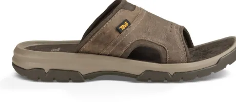 Slipper van Teva in bruin nubuck met aan de randen afgezet met mesh. De slipper biedt wat extra ruimte op de wreef door de rekbare stof waar die mee is afgezet. Er zit een stevige zool onder met profiel en heeft een comfortabel voetbed. ||Teva vindt zijn oorsprong in de water sport. De riviergids Mark Thatcher ontwierp een sandaal uit noodzaak om veilig de rivier de Colorado te bedwingen zonder uit te glijden op natte rotsen en oneffen terrein of ze zelfs te verliezen. Het originele product is nog steeds een belangrijk onderdeel van de collectie en vormt de basis van alle modellen. Het is uitermate geschikt voor het gebruik in en om het water(de modellen blijven drijven) en is in de loop van tijd ook zeer geschikt gebleken voor bergwandelaars, fietsers, kayakers, wandelaars en parachute springers en op de camping.
