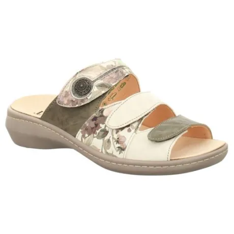 Slipper van Think met een bijna platte hak in groen met beige leer gecombineerd met een bloemenprint. De slipper is met leer gevoerd en gemaakt op de leest Camilla. Door de 3 klittebanden is die precies op maat voor de voet te maken. De voetbedden zijn uitneembaar. ||Think is een merk wat uit Oostenrijk komt en bekend staat om hun eigenzinnige collectie vervaardigd uit mooie en aparte materialen. De meeste voetbedden zijn uitneembaar. Het leer wordt plantaardig gelooid. Think maakt geen wijdte maten, maar de schoenen worden vaak op een bredere leest gemaakt. Think koopt u online bij Ruttenschoenen.nl