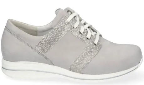 Veterschoen van Durea in licht grijs nubuck icm een fijne print croco print. Deze schoen valt in de groep Citywalker van Durea, waarbij het lopen door de extra hoge teensprong vergemakkelijkt wordt. De schoen heeft een bijna platte hak van 17 mm en rond de enkel zit een polster. De schoen heeft een 2 componenten stijve TPU zool, waardoor zeer geschikt voor hielspoor, peesplaatontsteking en een stijve grote teen. Geschikt voor uw eigen steunzool op een extra brede K plus wijdte, op de leest 288 met een stevig contrefort. Bij de K plus wijdte zit onder het voetbed een extra inlegzool die er ook uit kan en waardoor er nog extra ruimte voor een bredere voet is. ||Durea is een Nederlands fabricaat, met diverse leesten en wijdtematen. Het ontwerp en de afwerking geschiedt in Drunen. De productie vindt in het buitenland plaats, waar Durea fabrieken bezit, onder toezicht van eigen mensen. Iedere schoen ondergaat ca 200 handelingen, Daar Durea alles in eigen beheer heeft kunnen zij hun hoge kwaliteit waarborgen. Durea koopt u online en offline bij Ruttenschoenen.nl