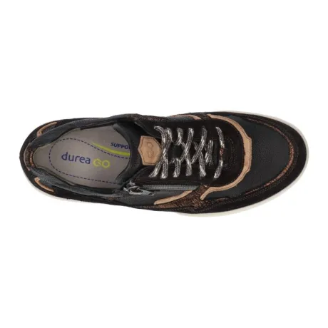 Sneaker van Durea op moderne nieuwe Go zool in zwart suede met leer gecombineerd met een croco inzet en een lichtgekleurde zool. Kenmerken van de innovatieve Go zool is dat die lichter van gewicht is en zorgt voor een ideaal looppatroon welke de natuurlijke houding van het lichaam stimuleert. Aan de zijkant zit een rits zodat als de veter eenmaal is ingesteld de schoen makkelijk aan en uit te trekken is. Tevens zorgt de zool voor veel demping. Gemaakt op een brede H wijdte op de leest 685. De hak is 1,7 cm hoog. De schoen heeft een uitneembaar voetbed en is geschikt voor uw eigen steunzool. ||Durea is een Nederlands fabricaat, met diverse leesten en wijdtematen. Het ontwerp en de afwerking geschiedt in Drunen. De productie vindt in het buitenland plaats, waar Durea eigen fabrieken bezit, onder toezicht van eigen mensen. Iedere schoen ondergaat ca 200 handelingen, Daar Durea alles in eigen beheer heeft kunnen zij hun hoge kwaliteit waarborgen. Durea koopt u off en online bij Ruttenschoenen.nl