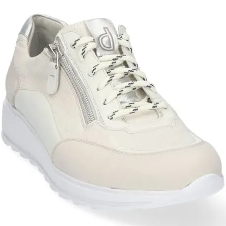 Sneaker van Durea in een beige combinatie suede met leer. Gemaakt op een extra brede K wijdte op de Sophie zool op de leest 688. Aan de zijkant zit een rits waardoor die makkelijk is aan en uit te trekken. Geschikt voor brede voeten met een uitneembaar voetbed waarvoor u uw eigen steunzool kunt vervangen. De schoen is stabiel en slijtvast en biedt veel demping bij de voorvoet. De schoen is gemaakt op een gebroken wijdte dwz dat de schoen in de hielpartij smaller is, waardoor die extra goed om de hiel sluit. De zool is van Eva gemaakt en de hak is 1,7 cm hoog. De zool met de Sofiezoolheeft een extra afwikkeling. ||Durea is een Nederlands fabricaat, met diverse leesten en wijdtematen. Het ontwerp en de afwerking geschiedt in Drunen. De productie vindt in het buitenland plaats, waar Durea eigen fabrieken bezit, onder toezicht van eigen mensen. Iedere schoen ondergaat ca 200 handelingen, Daar Durea alles in eigen beheer heeft kunnen zij hun hoge kwaliteit waarborgen.