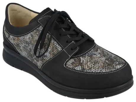 Dames veterschoen van FinnComfort in zwart nubuck met sier prent. Op een super brede leest ca een M wijdte, waarbij de voetbedden uitneembaar zijn en de schoen bij de tenen extra veel ruimte biedt. Met een bijna platte hak van ca 15 mm. ||FinnComfort is een Duits merk , wat nog steeds in Duitsland wordt gemaakt en vaak ook deels nog handwerk is, dat merk je en dat voel je. De optimale pasvorm verzekert een schokabsorberende en natuurlijke afwikkeling van de voet. De schoen biedt veel ruimte bij de tenen, zoals het eigenlijk hoort. Veel schoenen hebben 2 verwisselbare voetbedden, waaronder een voetreflex massagevoetbed en een normaal kurken ondersteunend voetbed. Er zijn verschillende types en leesten, waar FinnComfort geen wijdte aan verbindt, welke wij proberen aan te geven met welke wijdte dit overeenkomt. Finn Comfort koop je online bij Ruttenschoenen.nl normaal kurken ondersteunend voetbed. Er zijn verschillende types en leesten, waar FinnComfort geen wijdte aan verbindt, welke wij proberen aan te geven met welke wijdte dit overeenkomt