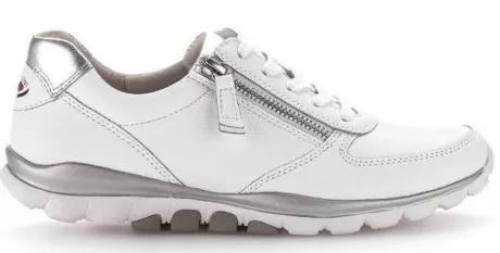 Sneaker van Gabor in wit leer met zilveren details op een wijdte G op de leest GFP met een Rolling soft onderwerk. Deze leest heeft een speciale zool waarbij het lopen vergemakkelijkt wordt. Aan de 2 zijden zit een rits, waardoor die makkelijk is aan en uit te tekken. Het voetbed is uitneembaar, dus geschikt voor uw eigen steunzool. De sneaker heeft een hakhoogte van 20 mm. ||Gabor is een Duits fabricaat, met diverse leesten en wijdtematen. Ze staan bekend om hun goede leesten en zachte leersoorten. Modisch comfortabel tegen betaalbare prijzen. Sommige hebben een uitneembaar voetbed. Gabor koop je online bij Ruttenschoenen.