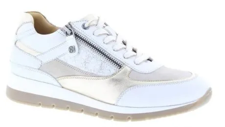 Sneaker van Helioform met een rits aan de zijkant in wit leer met licht beige, goud metallic en een print. De zool is in dezelfde combinatie gemaakt. Gemaakt op een brede H wijdte op de leest 293. Rond de enkel is de schoen gepolsterd. De schoen heeft een stevige zool. De voetbedden zijn uitneembaar en ze zijn dus geschikt voor uw eigen steunzool. ||Helioform is een Nederlands fabrikaat in een populaire prijsklasse, de schoenen worden in Nederland ontworpen en tegenwoordig onder streng toezicht voor goede arbeidsomstandigheden in India gemaakt. Ze maken verschillende wijdtematen en meestal zijn ze geschikt voor eigen steunzool. Helioform koopt u online bij Ruttenschoenen.nl