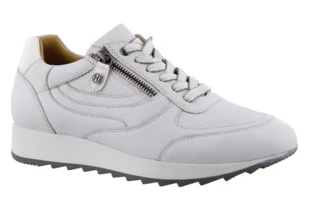 Sneakers van Helioform met een zijrits in wit leer icm een crocoprint. Door de rits zijn ze makkelijk uit en aan te trekken. Gemaakt op een extra brede K wijdte op de leest 250 met een bijna platte hak. De voetbedden zijn uitneembaar en ze zijn dus geschikt voor eigen steunzool. ||Helioform is een Nederlands fabrikaat in een populaire prijsklasse, de schoenen worden in Nederland ontworpen en tegenwoordig onder streng toezicht voor goede arbeidsomstandigheden in India gemaakt. Ze maken verschillende wijdtematen en meestal zijn ze geschikt voor eigen steunzool.