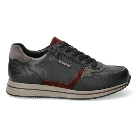 Sneaker van Mephisto in zwart leer met suede en grijs bij de hiel. Gemaakt op ca een H wijdte. Aan de buitenkant zit een rits waardoor als de veter eenmaal goed is ingesteld de schoen makkelijk is aan en uit te trekken. De schoen voelt lekker zacht aan. De zool heeft een profiel en is comfortabel met lopen. De schoen heeft een uitneembaar voetbed en is daardoor geschikt voor uw eigen steunzool. ||Mephisto is een Frans fabrikaat en heeft diverse fabrieken. Mephisto kenmerkt zich als een comfortabele schoen die meestal niet uitgelopen hoeft te worden, ook de zool is zacht en verend. Een echte schoen voor kilometers loopplezier. meestal niet uitgelopen hoeft te worden, ook de zool is zacht en verend. Een echte schoen voor kilometers loopplezier. Mephisto Koopt u online bij Ruttenschoenen.nl