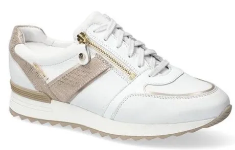 Sneaker van Mephisto in wit leer met een taupekleurige print gecombineerd. Aan de zijkant zit een rits, waardoor de schoen makkelijk uit en aan te trekken is. Gemaakt op een normale wijdte. De schoen heeft een lange vetersluiting, waardoor goed te verstellen is. De voetbedden zijn uitneembaar en de schoen is daardoor geschikt voor uw eigen steunzool. Rondom de enkels zit een polster. ||Mephisto is een Frans fabrikaat en heeft diverse fabrieken. Mephisto kenmerkt zich als een comfortabele schoen die meestal niet uitgelopen hoeft te worden, ook de zool is zacht en verend. Een echte schoen voor kilometers loopplezier. Mephisto koopt u online en offline bij Rutenschoenen.nl