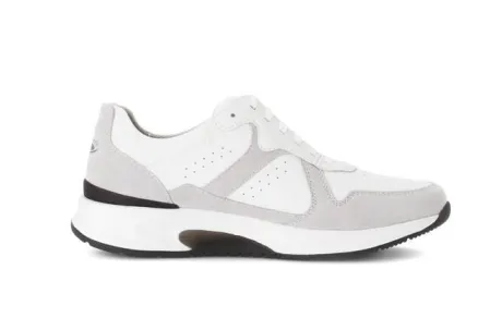 Rolling soft sneaker van Pius (de heren versie van Gabor). In wit leer met grijs suede in combinatie met mesh en zilveren details. De Rolling soft is een techniek in de zool waarop die lekker afwikkelt en het lopen vergemakkelijkt wordt. Gemaakt op een ruime G 1/2 wijdte en met een uitneembaar voetbed. ||Pius is de heren versie van Gabor en worden gekenmerkt door een lichter gewicht en zachte leersoorten. De Rolling soft maakt het lopen en afwikkelen makkelijk.