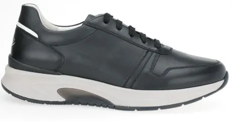Rolling soft sneaker van Pius (de heren versie van Gabor). In zwart leer met accenten en een lichtgekleurde zool. De Rolling soft is een techniek in de zool waarop die lekker afwikkelt en het lopen vergemakkelijkt wordt. Gemaakt op een ruime G 1/2 wijdte en met een uitneembaar voetbed. ||Pius is de heren versie van Gabor en worden gekenmerkt door een lichter gewicht en zachte leersoorten. De Rolling soft maakt het lopen en afwikkelen makkelijk.