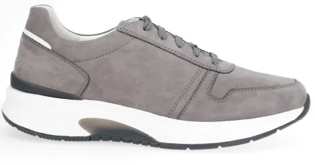 Rolling soft sneaker van Pius (de heren versie van Gabor). In midden grijs nubuck met wit en zwarte accenten en een witte zool. De Rolling soft is een techniek in de zool waarop die lekker afwikkelt en het lopen vergemakkelijkt wordt. Gemaakt op een ruime G 1/2 wijdte en met een uitneembaar voetbed. ||Pius is de heren versie van Gabor en worden gekenmerkt door een lichter gewicht en zachte leersoorten. De Rolling soft maakt het lopen en afwikkelen makkelijk.