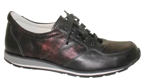 Veter schoen van schneider op een smalle wijdte C. In zwart leer met een zwart met bordeaux print gecombineerd. De hak is bijna plat en de voetbedden zijn dun en wat moeilijker eruit te halen. Doordat deze leest echt smal is, heb je er vaak een hele maat groter van nodig. Dit geldt niet als u bekend bent met Schneider. ||Schneider is een specialistisch Zwitsers merk wat zich heeft gericht op de smalle voet. Ze gebruiken mooie leermaterialen en zijn voor mensen met hele smalle voeten een uitkomst.