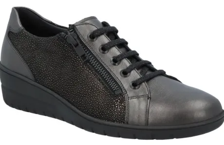 Sneaker van Solidus, verstelbaar met een veter in grijs leer met aan de zijkant een fantasie print. Geschikt voor een steunzool gemaakt op een brede H wijdte, op de leest Helia. De sleehak is iets hoger en de voetbedden zijn uitneembaar, daardoor is de schoen geschikt voor eigen steunzool. ||Solidus is een Duits fabricaat, met diverse leesten en wijdtematen, van smal tot super breed. Ze gebruiken zachte leersoorten, waardoor ze vaak zeer comfortabel en geschikt voor gevoelige voeten zijn. Vor de zeer gevoelige en of diabete voet, maken ze ook nog een speciale collectie “Solicare” Veel leesten en artikelen komen vaak weer terug, veelal in een andere uitvoering. Solidus koop je off en online bij Ruttenschoenen.nl