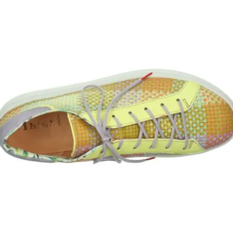 Sneaker van Think in een gele combinatie zacht leer met een vlechtwerk print, wat de sneaker net wat extra’s geeft. De sneaker heeft een lange vetersluiting, waardoor die aan veel voeten past. De schoen heeft een stevig contrefort en is gemaakt op de leest Kumi. De zool is stabiel en de hak is bijna plat. De voetbedden zijn uitneembaar waardoor de schoen geschikt is voor een eigen steunzool. ||Think is een merk wat uit Oostenrijk komt en bekend staat om hun eigenzinnige collectie vervaardigd uit mooie en aparte materialen. De meeste voetbedden zijn uitneembaar. Het leer wordt plantaardig gelooid. Think maakt geen wijdte maten, maar de schoenen worden vaak op een bredere leest gemaakt.