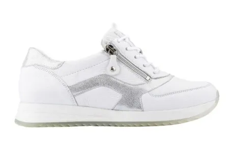 Sneaker van Waldlaufer met een rits aan de zijkant in wit met zilverkleurig leer. Geschikt voor een brede voet op een H wijdte op de leest Vicky. i De hak is bijna plat en de schoen is licht van gewicht. De voetbedden zijn uitneembaar en daardoor is de schoen geschikt voor uw eigen steunzool. ||Waldlaufer is een Duits merk. Kenmerkend is dat ze licht zijn van gewicht en zacht van leer. Er zijn verschillende wijdtematen en meestal zijn de voetbedden uitneembaar.